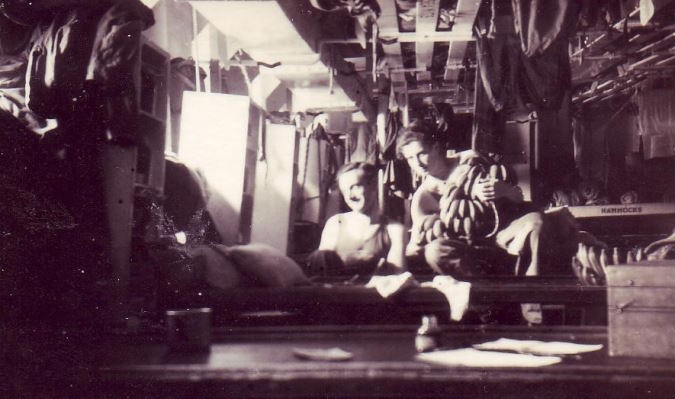 Het voorruim bleek inderdaad klein te zijn. Aan het plafond waren de leidingen van elektriciteit, stoom en water aangebracht en daaronder waren houten rekken voor het stouwen van onze uitrusting. Aan de rekken hingen de hangmatten die na een week buitengewoon van dienst zouden zijn. De tafels waren in de wand bevestigd met lange banken aan weerszijden van de tafels. In een hoek stond een lege oliedrum als toilet, die iedere dag op zee over de railing moest worden leeg gegooid, wat na een paar dagen makkelijker gezegd dan gedaan was. Wij vertrokken in het donker met de meeste schepelingen staande aan de railing. Verder op de waterweg, voeren vele bootjes en politieboten langszij, met vele mensen aan boord die afscheid kwamen nemen. De politieboten beschenen met sterke schijnwerpers de mensen aan de overzijde van de kade, zodat de soldaten aan boord met verrekijkers ze konden zien staan zwaaien.