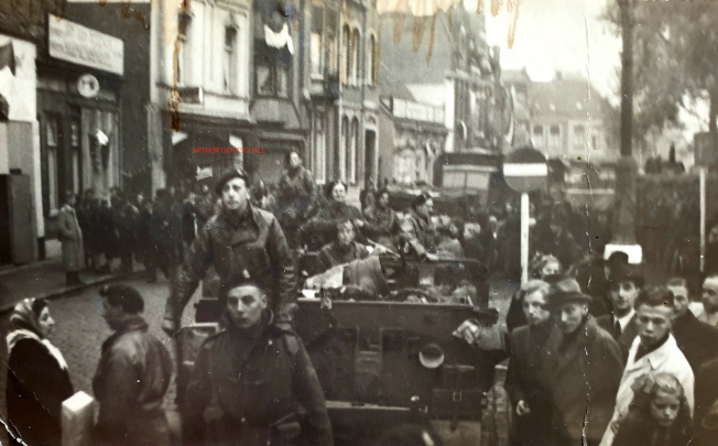 In deze Nederlandse stad (vermoedelijk Alphen aan den Rijn) wordt de Brigade uitbundig onthaald. Arthur staand in het midden.