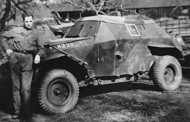 Daan van de Velde naast een verkenningsvoertuig van de brigade (collectie Richard van de Velde)