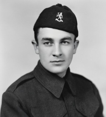 Wim in Guelph (Bron: NIMH) 'Hierdoor kreeg de scoutcar van wmr. Geerards en chauffeur Veerman van Ltn. Driebeek bericht om direct terug te keren maar negeerde de waarschuwing beslist niet te hard achteruit te rijden en moest voor de brandende tank uitwijken en belandde via een schuttersput in een naast de weg gelegen ven en sloeg over de kop.'